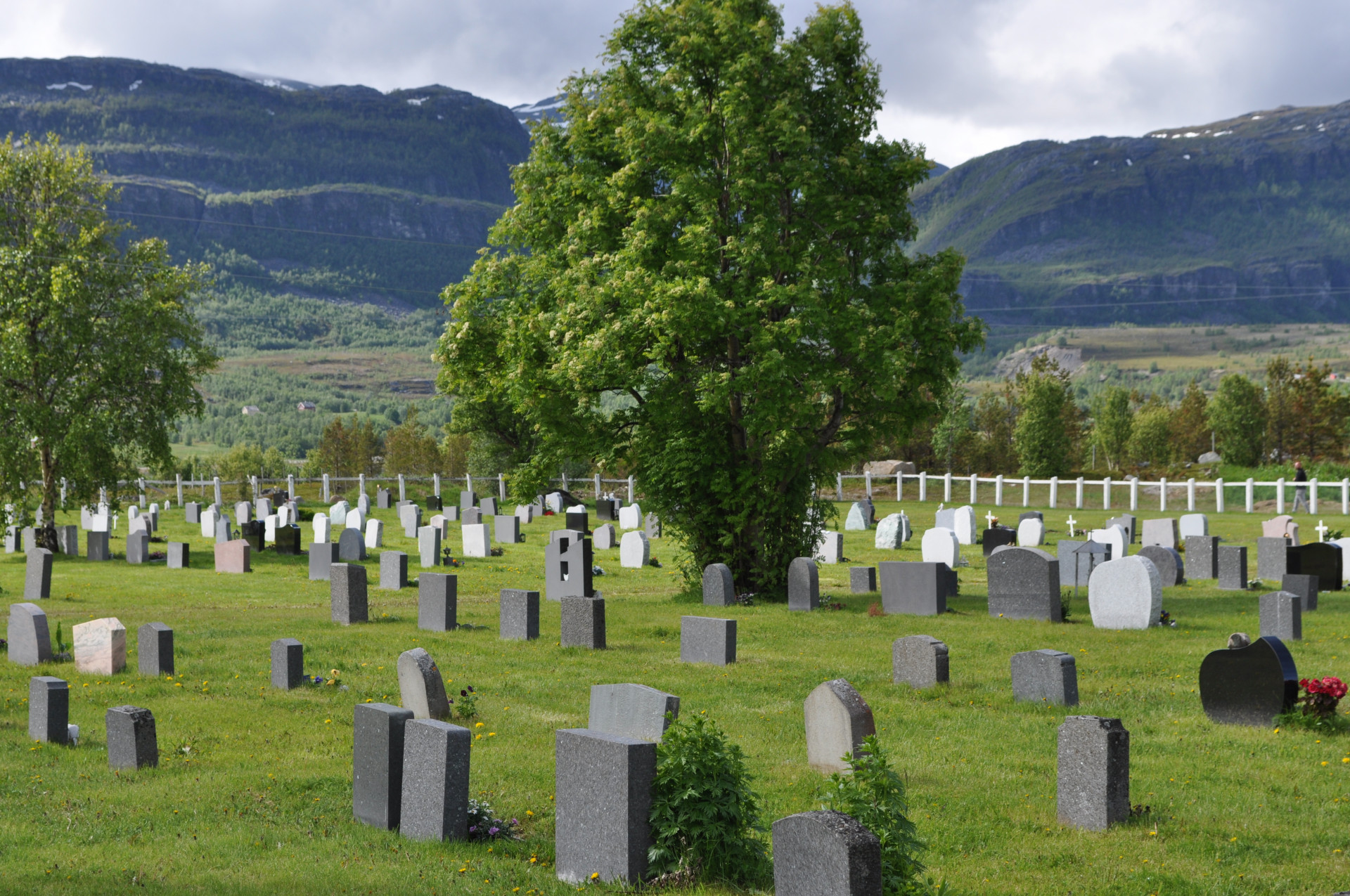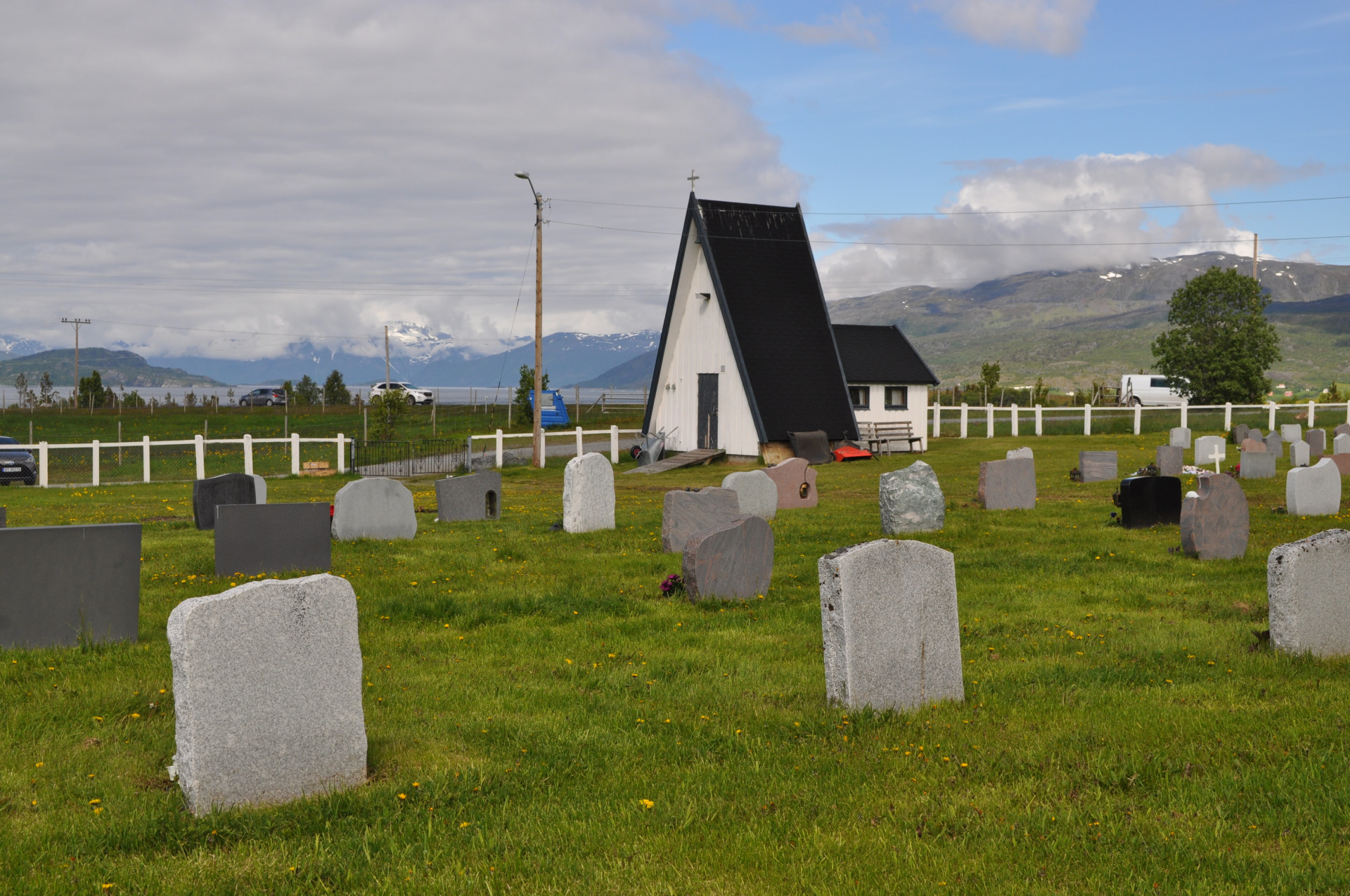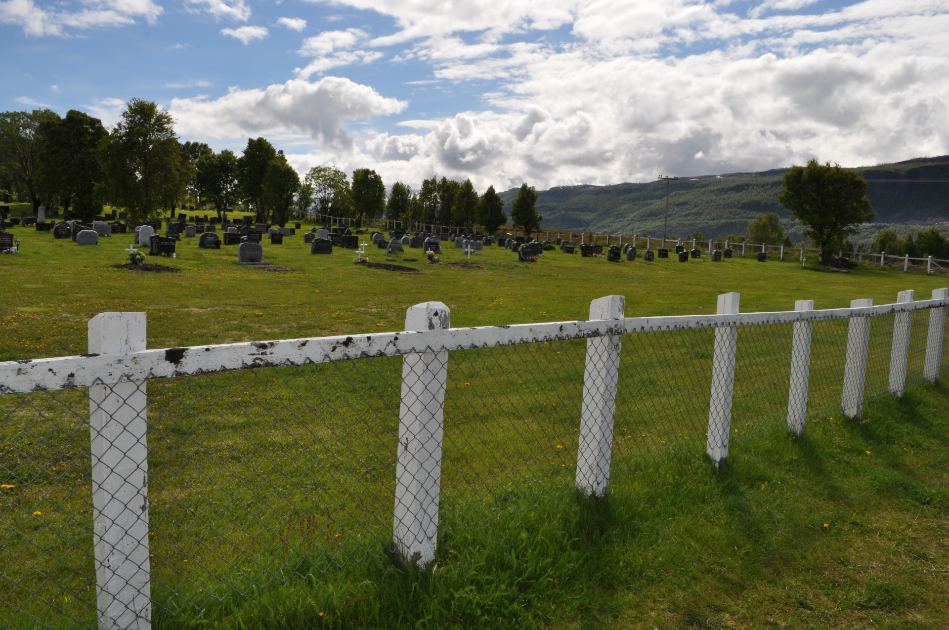 Wiejski cmentarz w miejscowości Nordstraumveien, przy drodze numer 6 w kierunku North Cup. Typowa stylistyka skandynawska, skromne groby, poszanowanie zmarłego i natury. Charakterystyczne dla regionu ozdoby, statuetki i reliefy gołębi. Autor zdjęć Jan Sz. Czerwiec 2019r.