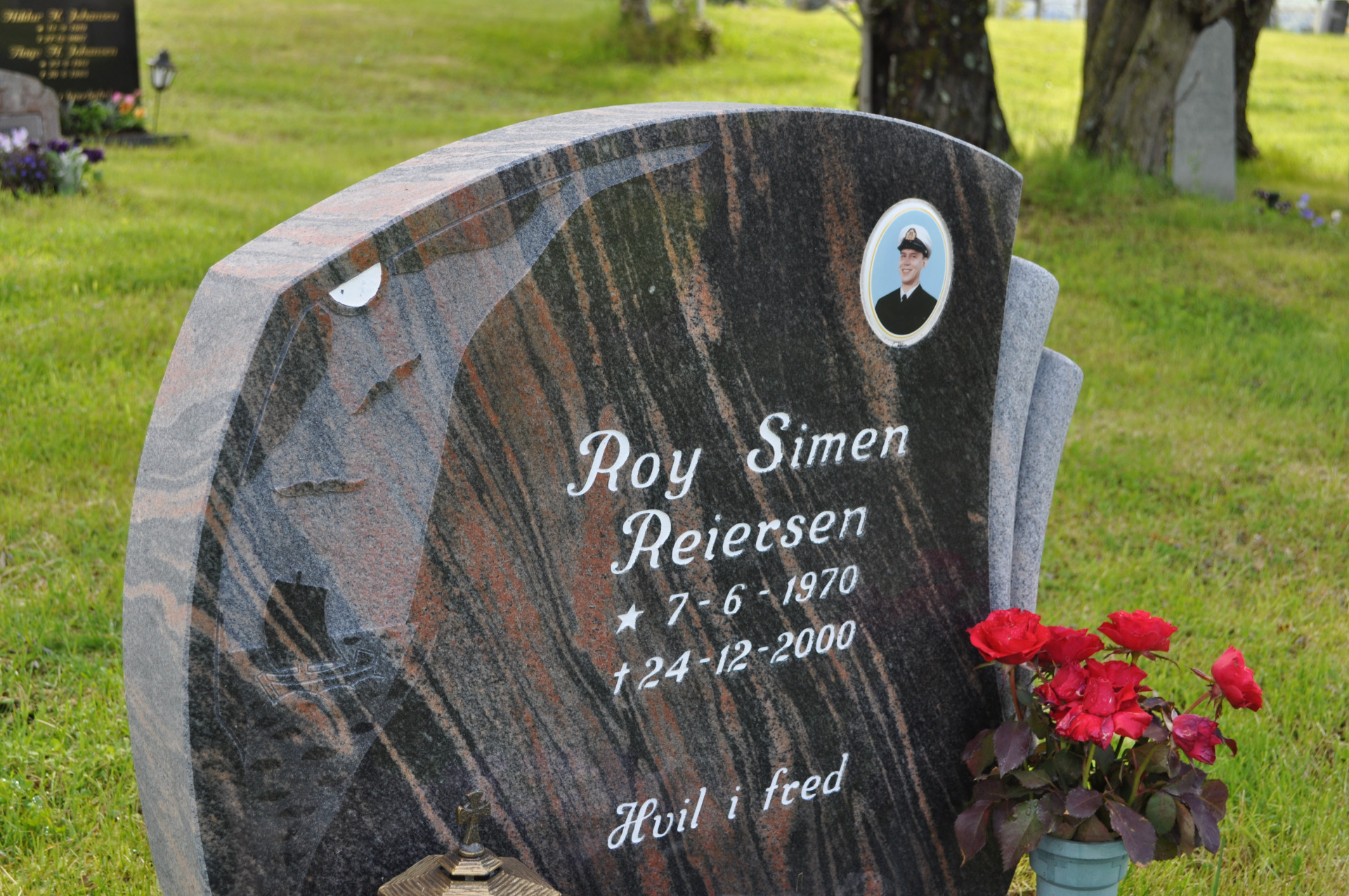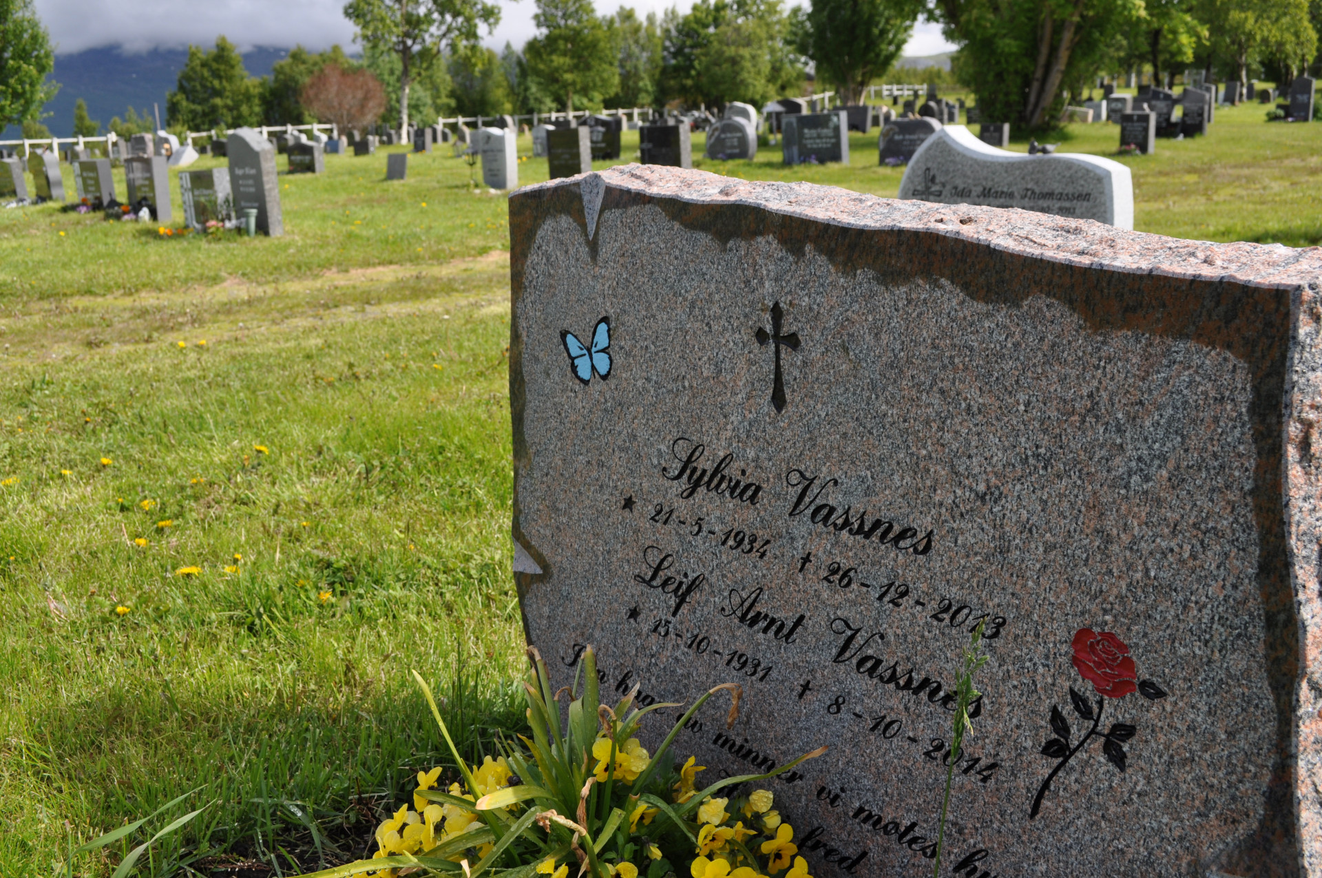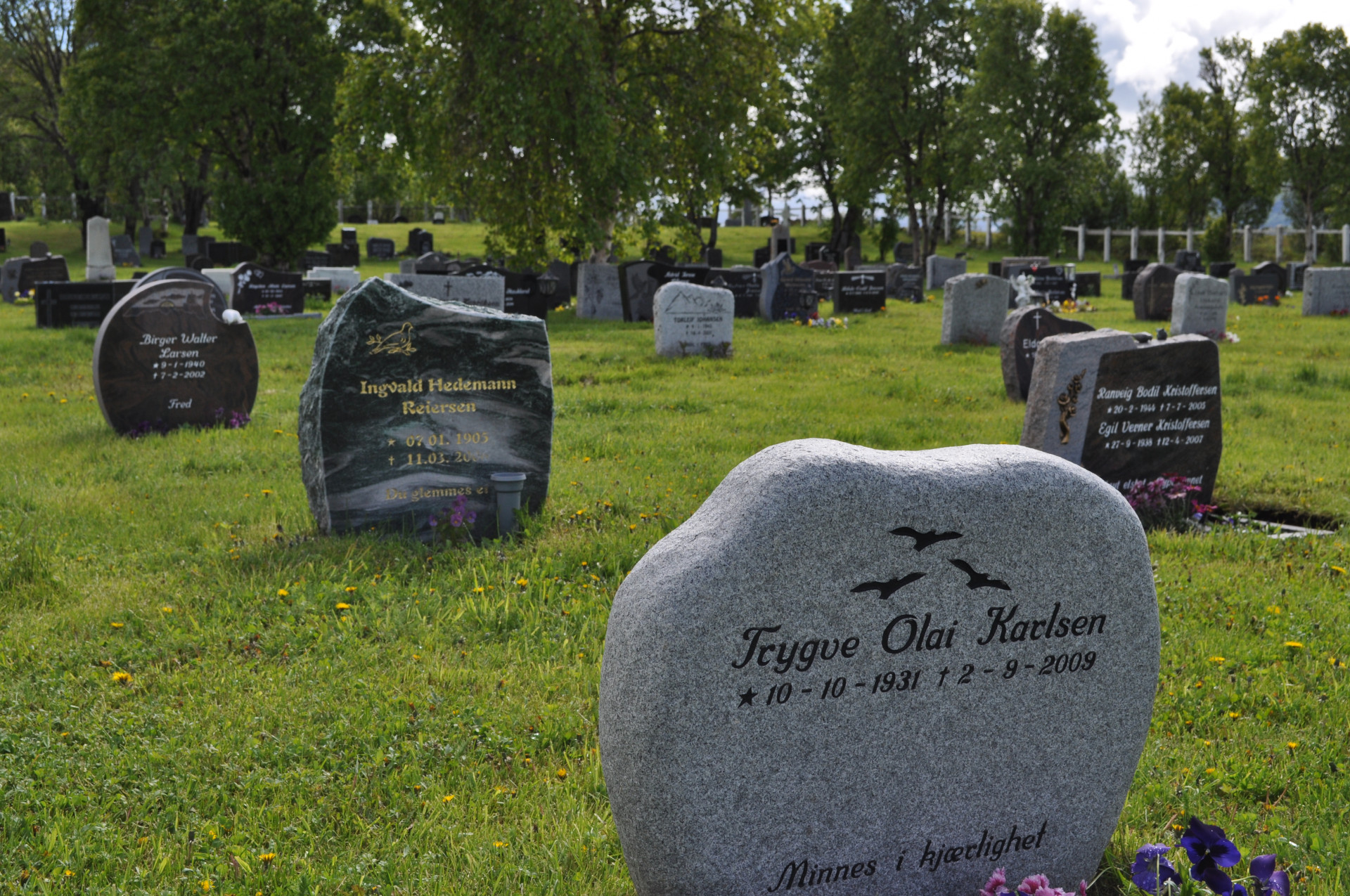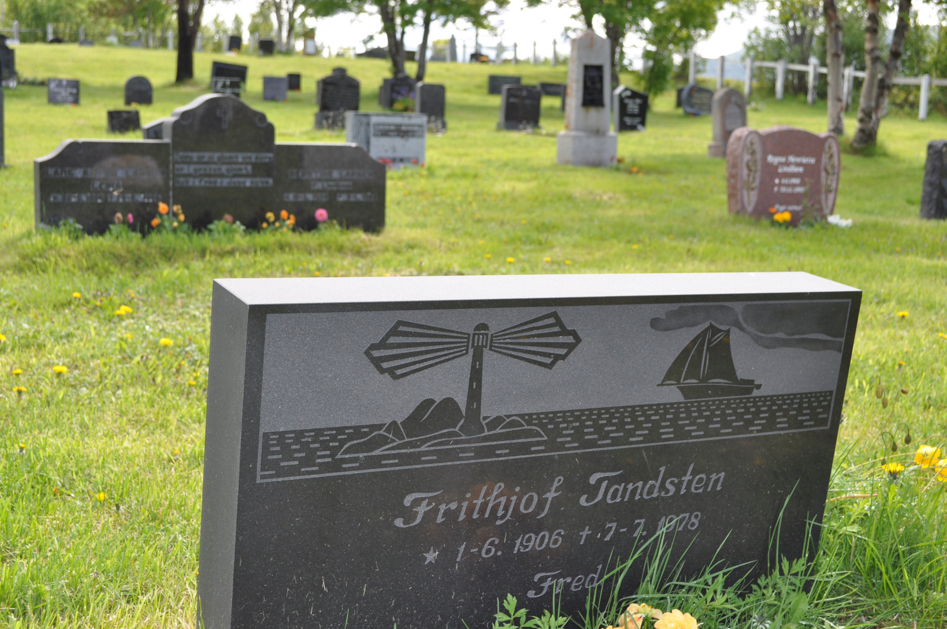 Wiejski cmentarz w miejscowości Nordstraumveien, przy drodze numer 6 w kierunku North Cup. Typowa stylistyka skandynawska, skromne groby, poszanowanie zmarłego i natury. Charakterystyczne dla regionu ozdoby, statuetki i reliefy gołębi. Autor zdjęć Jan Sz. Czerwiec 2019r.